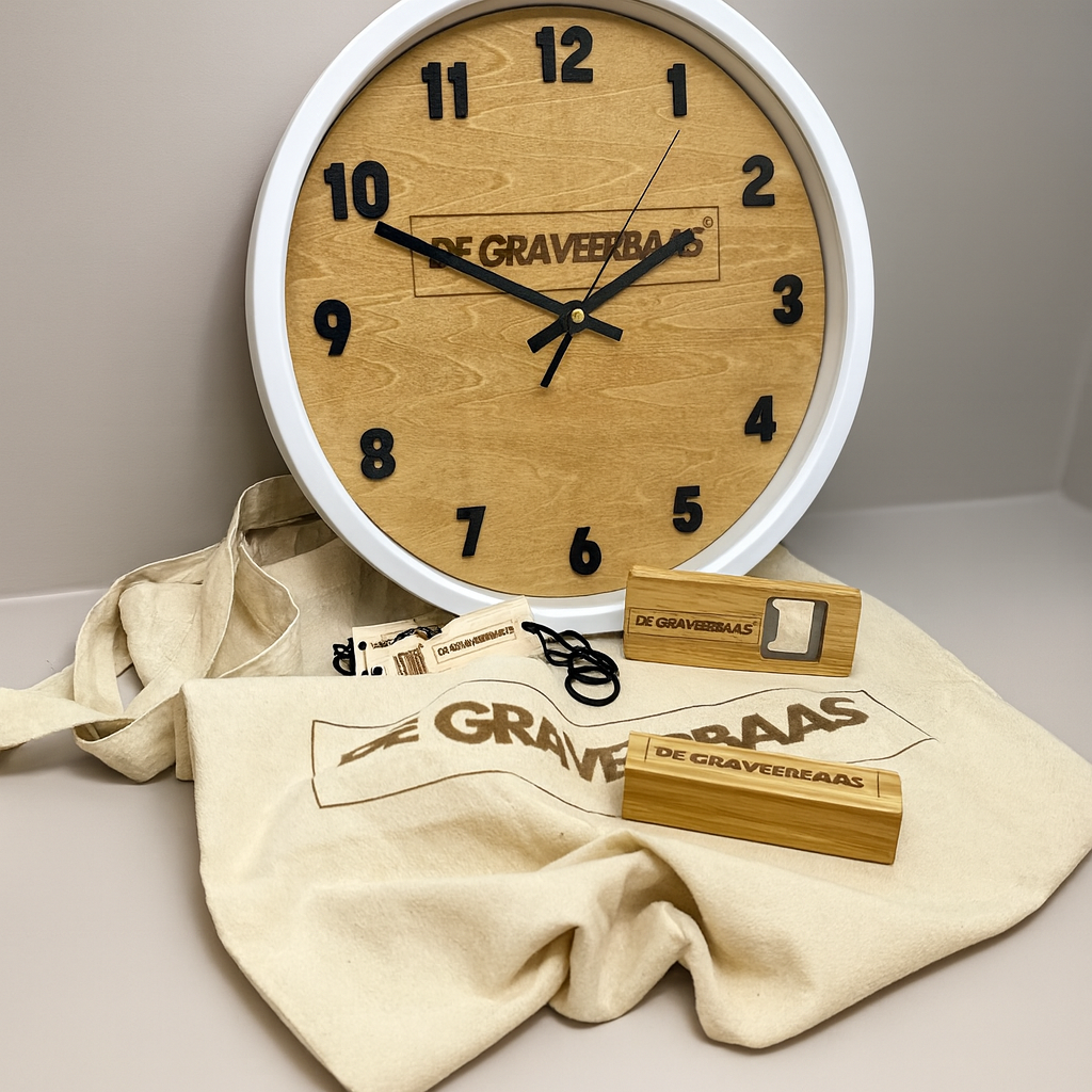 Van gegraveerde onderzetters en borrelplanken tot bedrukte tassen en keychains. Ideaal als relatiegeschenk of voor events.